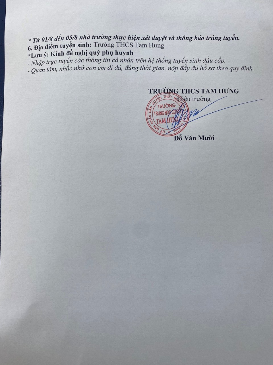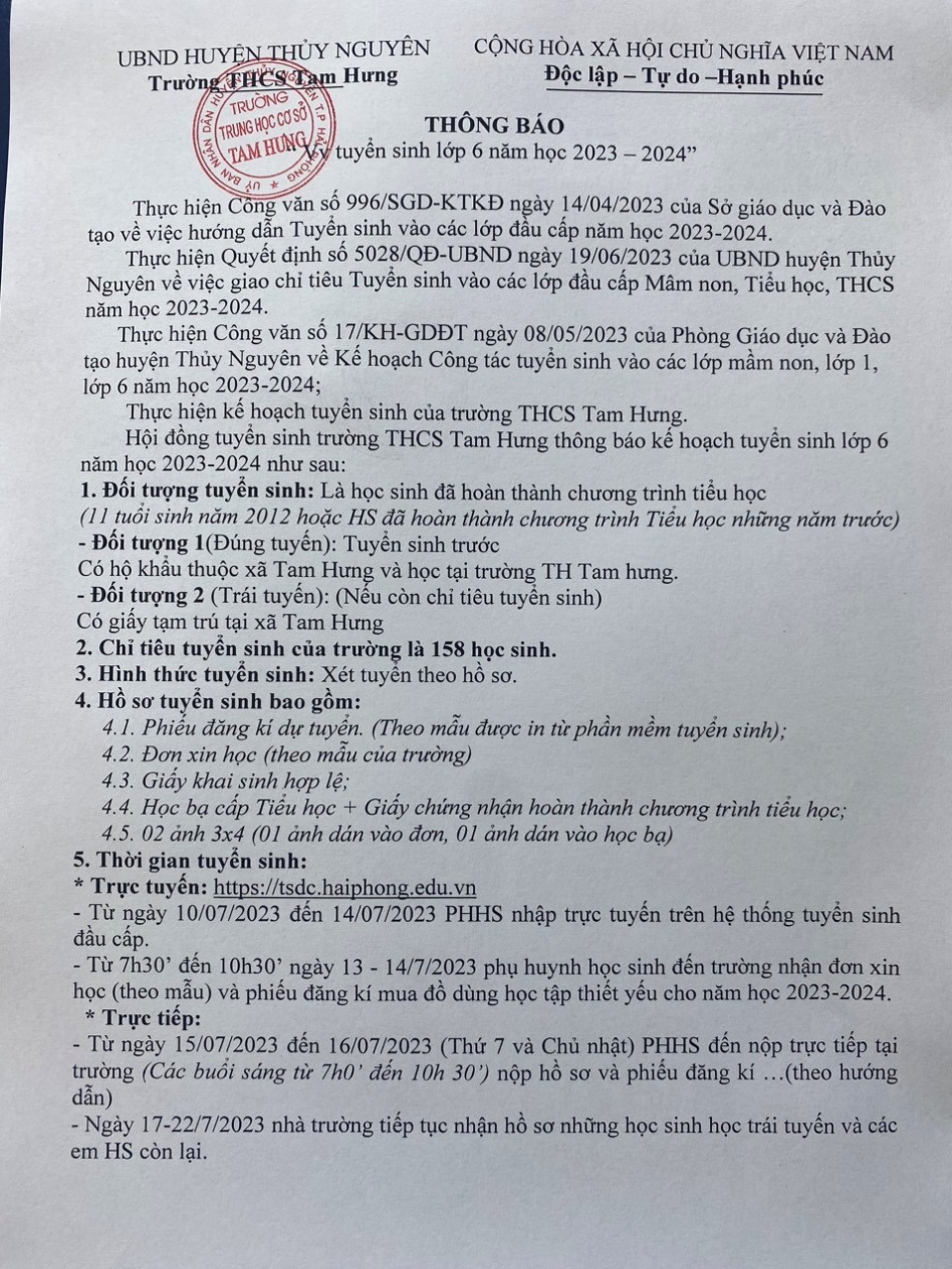 Lại một năm học mới sắp bắt đầu, để giúp các quý phụ huynh và các em học sinh sắp bước lên cấp THCS nắm bắt được thời gian tuyển sinh cho năm học mới, trường THCS Tam Hưng thông báo kế hoạch tuyển sinh lớp 6 năm học 2023-2024 như sau: